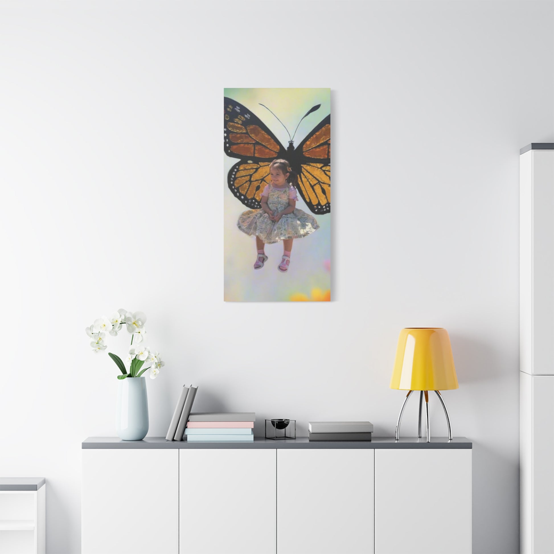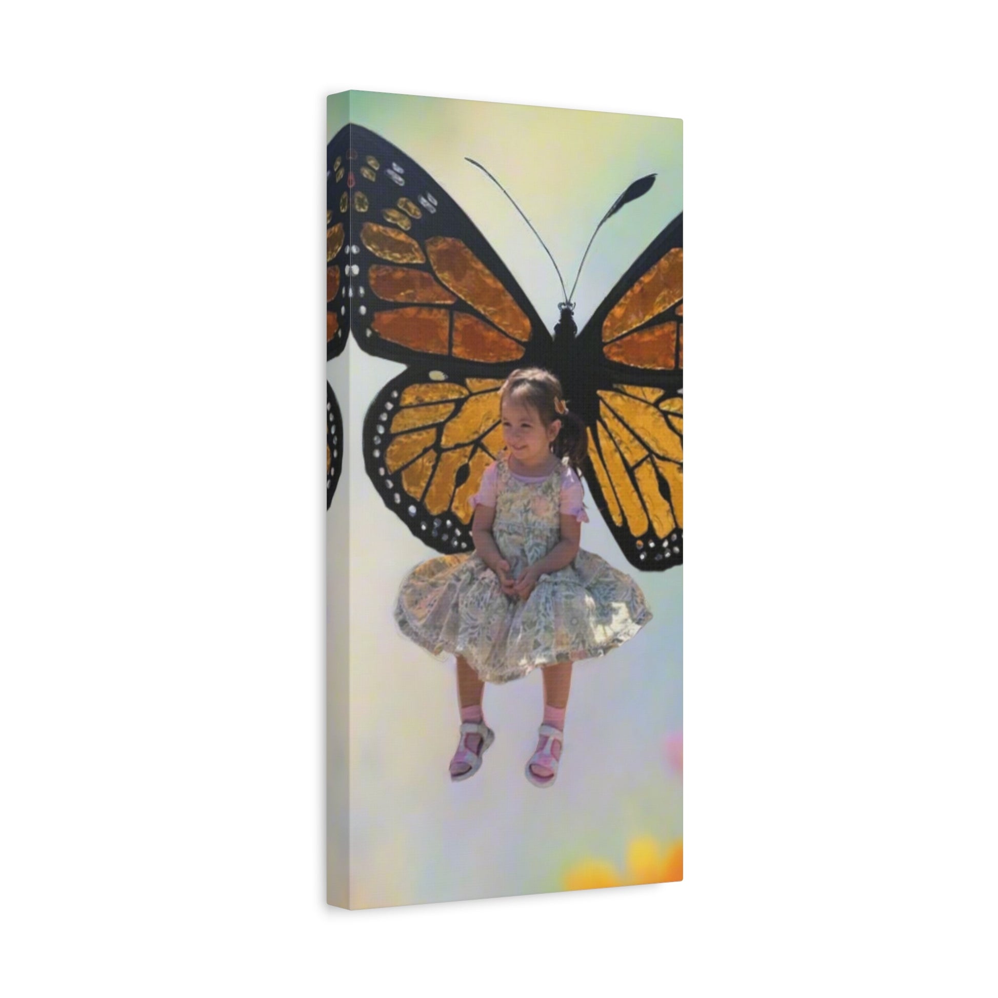 This canvas print captures a moment of pure, sunlit wonder with vibrant Monarch butterfly wings and a joyful child, embodying the concept of finding your wings. It is a celebration of growth, innocence, and limitless potential, encouraging us all to dream big. Perfect for those who seek inspiration and positivity in their home decor. Ideal for nurseries, children's rooms, or anyone who loves butterflies and whimsical art. Great for gifts on birthdays, baby showers, or housewarmings.