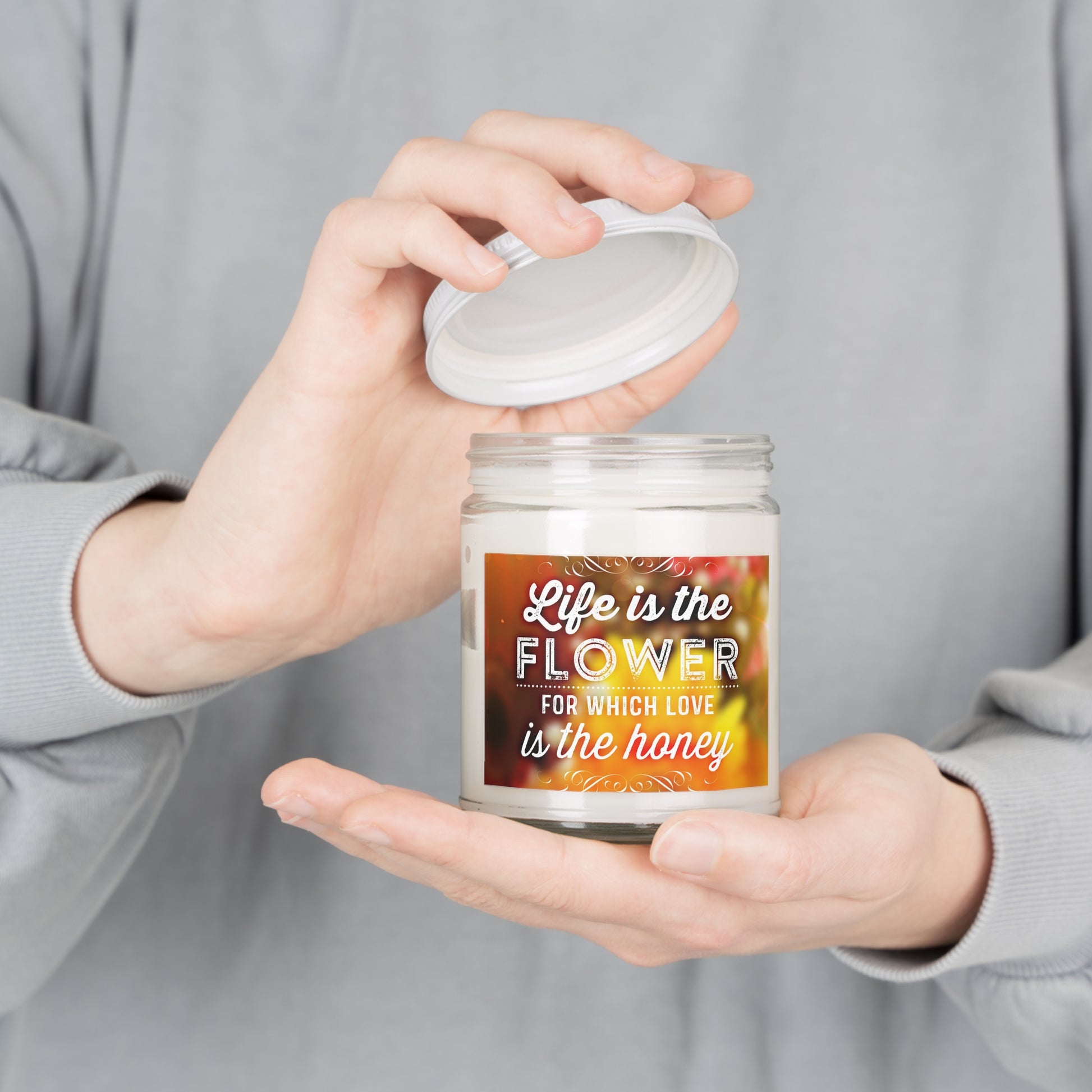 A scented candle featuring the quote “Life is The Flower for Which Love is The Honey”. Perfect for creating a cozy and inviting atmosphere in any room. Ideal for those who enjoy relaxing with a candlelit ambiance. Relevant for holidays, celebrations, and everyday use.